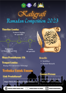 Rangkaian kegiatan Favorable Ramadan yang pertama adalah Ramadan Competition. Nah di Ramadan Competition ini terdiri dari 2 lomba yang tentunya menarik untuk diikuti. Untuk lomba yang pertama adalah lomba kaligrafi yang diikuti oleh beragam antusiasme peserta, mulai dari Mahasiswa Akuntansi, Mahasiswa Umum, Siswa SMA/SMK, dan santri dari berbagai berbagai Pondok Pesantren yang ada di Tasikmalaya. Untuk semua hasil karya para peserta dari lomba kaligrafi juga sangat indah sehingga akan membuat juri sulit untuk menentukan pemenang lomba karena karya-karya kaligrafi peserta yang unik, kreatif, dan indah. Untuk lomba kaligrafi dilaksanakan di gedung C 2.04 dan C 2.05 Fakultas Ekonomi Universitas Siliwangi