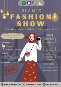 Kemudian untuk lomba yang kedua adalah Islamic Fashion Show yang tidak kalah menarik. Di lomba Islamic Fashion Show ini para peserta berlenggak-lenggok dengan anggunnya menampilkan busana Islami Kekinian. Untuk tempat pelaksanaannya sendiri dilaksanakan di Gedung Mandala Universitas Siliwangi.