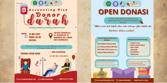 Selain itu, Accountig Rise memiliki beberapa tujuan, antara lain ; meningkatkan rasa syukur, iman, dan taqwa kepada Tuhan Yang Maha Esa, membangun kesadaran sosial dan kepekaan lingkungan, serta sebagai wahana silaturahmi sehingga dapat meningkatkan persaudaraan dan kebersamaan. Adapun bentuk kegiatan dari Accounting Rise sendiri yaitu berupa donor darah dan bakti sosial. Untuk kegiatan donor darah ini dilaksanakan pada Senin, 22 Mei 2023 yang kegiatannya berlokasi di Palang Merah Indonesia (PMI) Kota Tasikmalaya. Baru setelah dilaksanakan acara donor darah kemudian dilanjut dengan acara bakti sosial ke Panti Asuhan Syubbanul Wathon yang berada di Jl, Sutisna Senjaya, Kec. Tawang, Kota Tasikmalaya.