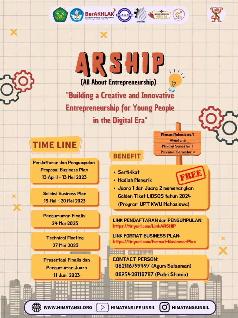 Adapun bentuk kegiatan ARSHIP tahun sekarang yaitu berupa lomba Business Plan dengan tema “Building a Creative and Innovative Entrepreneurship for Young People in the Digital Era”. Di ARSHIP ini memiliki 4 finalis yang sudah dipilh yang nantinya tampil pada puncak acara Accounting Week 39 di hadapan juri dan penonton untuk mempresentasikan hasil Business Plan yang sudah dibuat sebelumnya. Nah untuk kegiatan ARHIP maupun Accounting Week diselenggarakan di Gedung Kesenian Dadaha Kota Tasikmalaya.